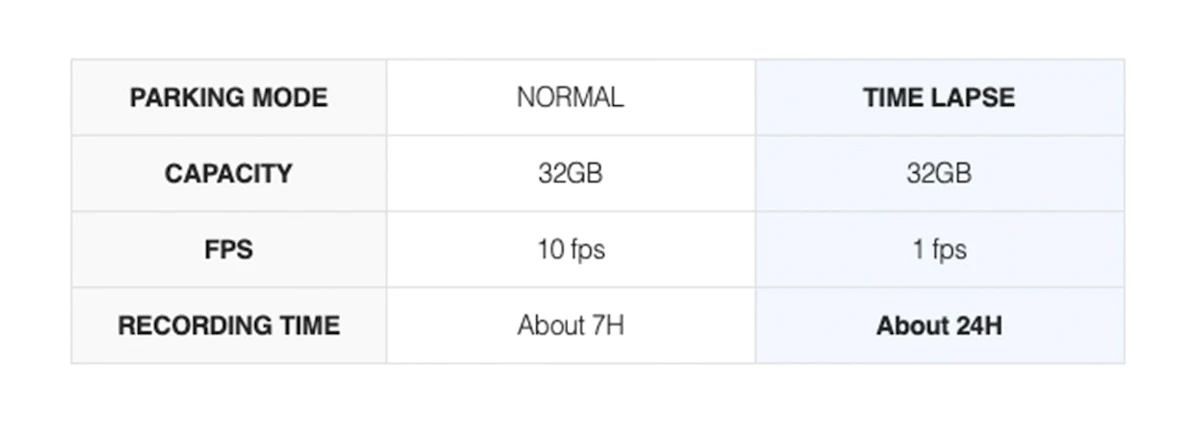 ระบบ Time Laps Parking Mode อัจฉริยะจะช่วยลดภาระของหน่วยความจำ เพิ่มประสิทธิภาพและระยะเวลาในการบันทึกที่ยาวนานขึ้นกว่าระบบจอดรถ แบบ Parking mode ธรรมดา ระบบจะทำการลดจำนวนเฟรมของภาพ โดยอัตโนมัติเมื่อตัดเข้าสู่ระบบดังเกล่าโดยที่ตัวกล้อง Iroadจะทำการบันทึกภาพ 1 เฟรมต่อวินาทีในขณะที่ไม่มีการเคลื่อนไหว และจะปรับเพิ่มเป็น 10 เฟรมต่อวินาที โดยทันทีที่ตรวจพบความเคลื่อนไหวหรือแรงสั่นสะเทือน
