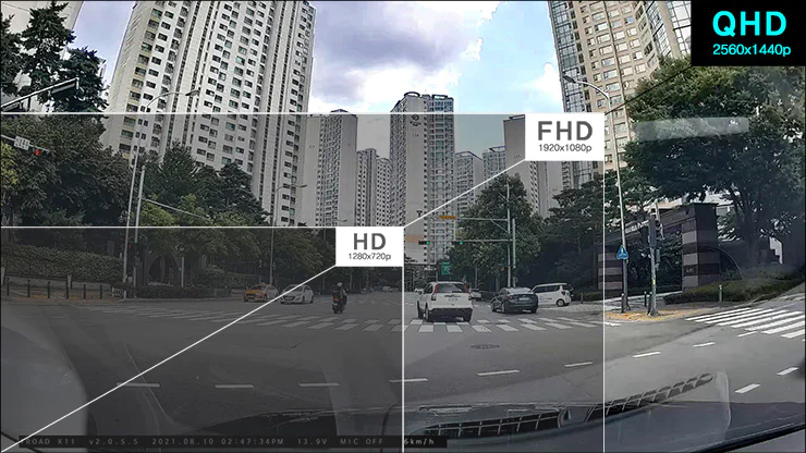 ความละเอียด 2560x1440P มาพร้อมเซนเซอร์ 5ล้านพิกเซล ให้ภาพที่ชัดเจนและคมชัดยิ่งขึ้น เมื่อใช้เซ็นเซอร์ SONY IMX335 ให้คุณภาพของวิดีโอที่ดีที่สุด* แม้ในสภาพแสงน้อย จับภาพได้คมชัดกว่าความละเอียด HD ถึง 4 เท่า IROAD X11 แสดงการบันทึกด้านหน้าและด้านหลัง 1440p QHD ทั้งกลางวันและกลางคืน