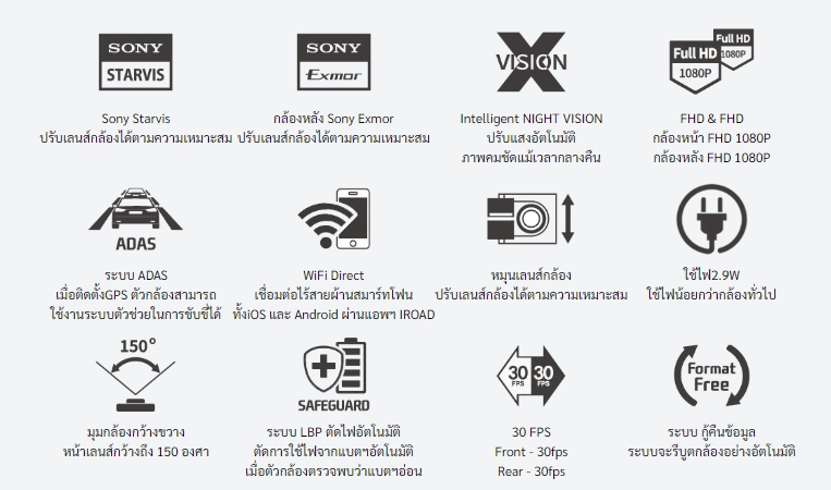 WiFi : เชื่อมต่อไร้สายผ่านสมาร์ทโฟน ทั้ง iOS และ Android ผ่านแอพฯ IROAD