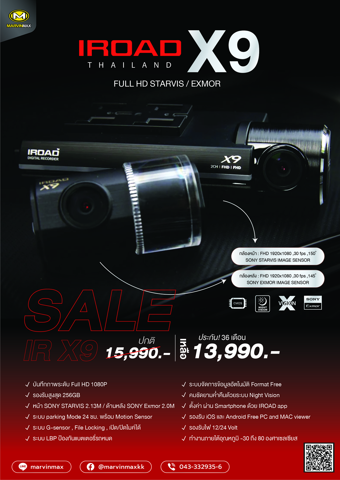 เซนเซอร์พรีเมี่ยมถูกออกแบบมา เพื่อการขับขี่กลางคืนโดยเฉพาะ IROAD X9 ประกอบด้วย SONY STARVIS ที่สามารถบันทึกภาพขณะกลางคืนได้อย่างคมชัด ให้รายละเอียดภาพที่ชัดเจนเป็นอย่างดี