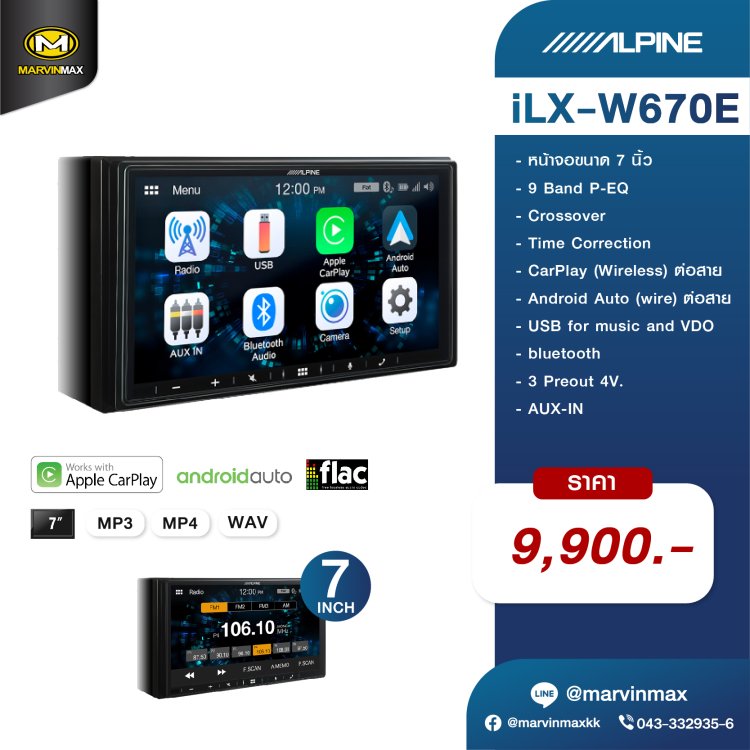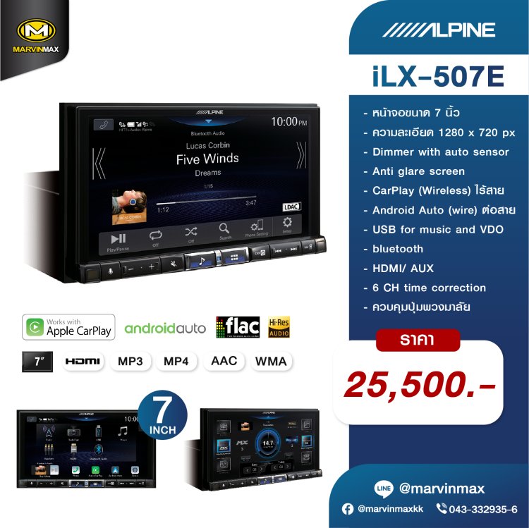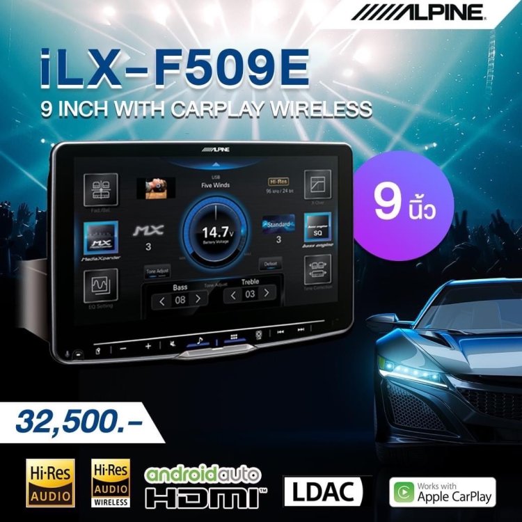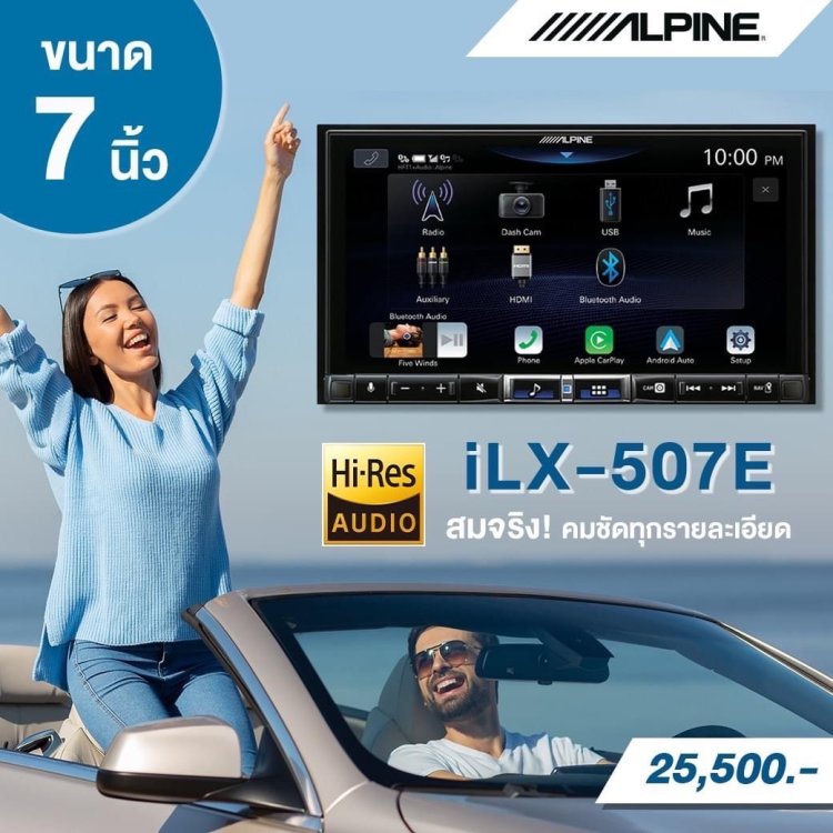 จอเครื่องเสียงรถยนต์รุ่นท็อป หน้าจอสัมผัสขนาด 7 นิ้ว ความละเอียดสูง รองรับ Apple CarPlay / Android Auto ทั้งแบบมีสายและไร้สาย พร้อม Hi-Res Audio ให้คุณภาพเสียงเหนือระดับ เชื่อมต่อครบครันทั้ง Bluetooth, USB, HDMI และรองรับการปรับแต่งเสียงขั้นสูง เหมาะสำหรับผู้ที่ต้องการประสบการณ์ภาพและเสียงระดับพรีเมียมในรถ