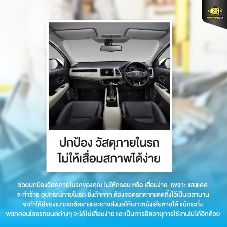 ช่วยปกป้องวัสดุภายในรถของคุณ ไม่ให้กรอบ หรือ เสื่อมง่าย  เพราะ แสงแดดจะทำร้าย อุปกรณ์ภายในรถ ยิ่งถ้าหาก ต้องจอดรถตากแดดทิ้งไว้เป็นเวลานานจะทำให้สีของเบาะรถซีดจางและอาจส่งผลให้เบาะหนังเสียหายได้ แม้กระทั่วพวกคอนโซลรถยนต์ต่างๆ จะได้ไม่เสื่อมง่าย และเป็นการยืดอายุการใช้งานไปได้อีกด้วย