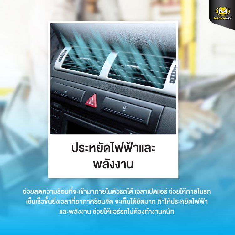ช่วยลดความร้อนที่จะเข้ามาภายในตัวรถได้ เวลาเปิดแอร์ ช่วยให้ภายในรถเย็นเร็วขึ้นยิ่งเวลาที่อากาศร้อนจัด จะเห็นได้ชัดมาก ทำให้ประหยัดไฟฟ้าและพลังงาน ช่วยให้แอร์รถไม่ต้องทำงานหนัก