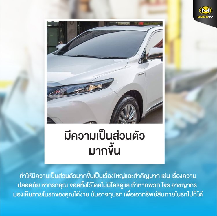 ทำให้มีความเป็นส่วนตัวมากขึ้นเป็นเรื่องใหญ่และสำคัญมาก เช่น เรื่องความปลอดภัย หากรถคุณ จอดทิ้งไว้โดยไม่มีใครดูแล ถ้าหากพวก โจร อาชญากร มองเห็นภายในรถของคุณได้ง่าย มันอาจทุบรถเพื่อเอาทรัพย์สินภายในรถไปก็ได้