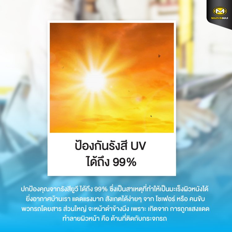 ปกป้องคุณจากรังสียูวี ได้ถึง 99% ซึ่งเป็นสาเหตุที่ทำให้เป็นมะเร็งผิวหนังได้ ยิ่งอากาศบ้านเรา แดดแรงมาก สังเกตได้ง่ายๆ จาก โชเฟอร์ หรือ คนขับพวกรถโดยสาร ส่วนใหญ่ จะหน้าดำข้างนึง เพราะ เกิดจาก การถูกแสงแดดทำลายผิวหน้า คือ ด้านที่ติดกับกระจกรถ
