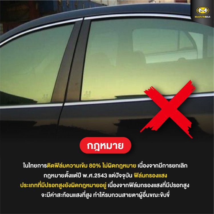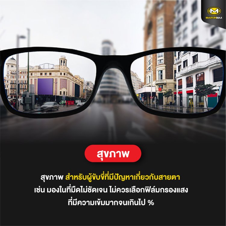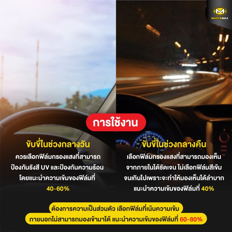 – ขับขี่ในช่วงกลางคืน เลือกฟิล์มกรองแสงที่สามารถมองเห็นจากภายในได้ชัดเจน ไม่เลือกฟิล์มสีเข้มจนเกินไป เพราะจะทำให้มองเห็นได้ลำบาก แนะนำความเข้มของฟิล์มที่ 40%